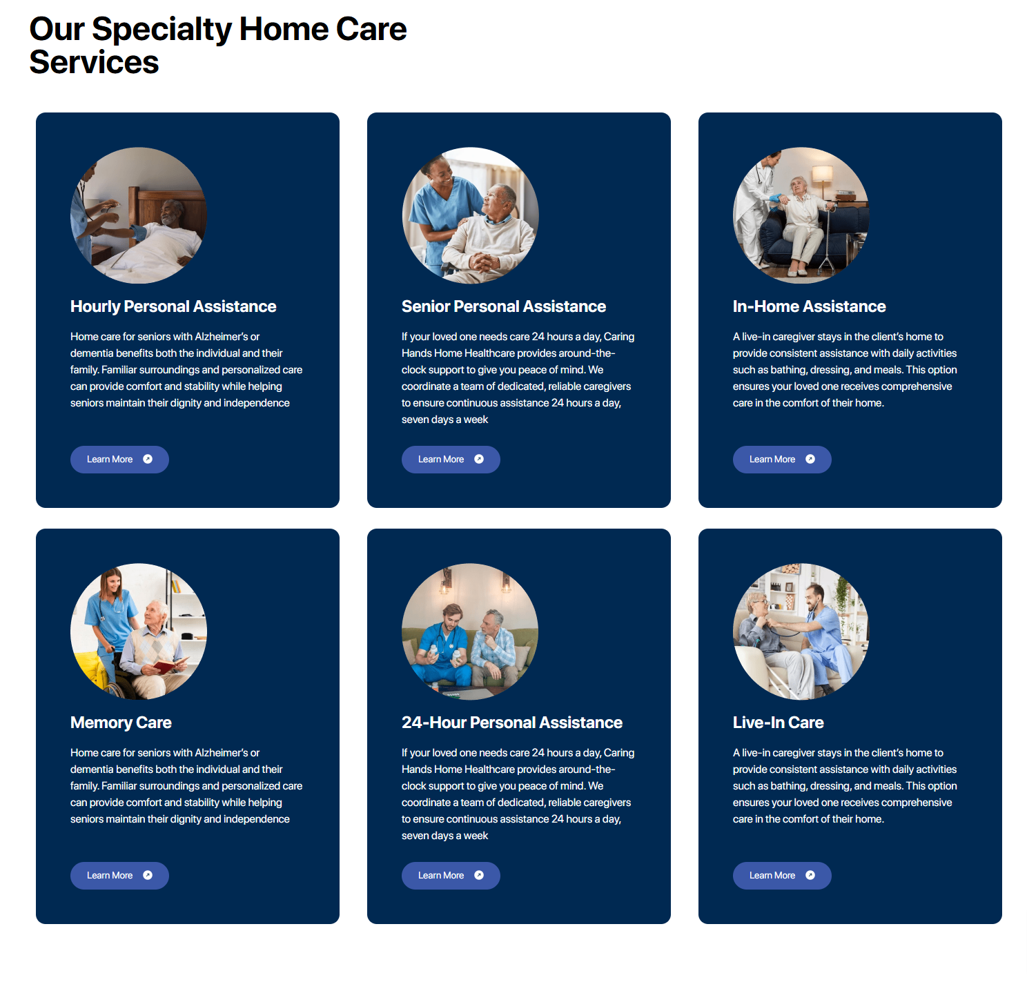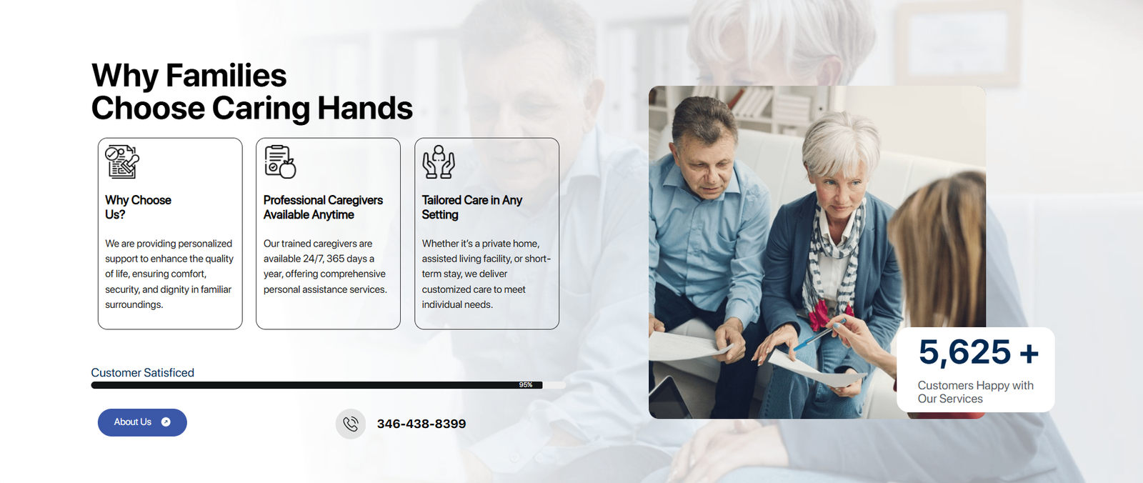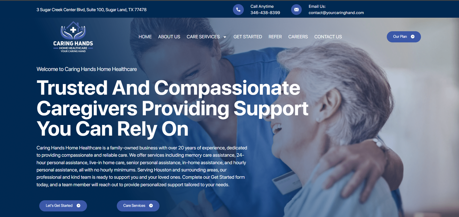 Caring Hands Home Healthcare is a U.S.-based provider of non-medical services, catering to the needs of individuals who require compassionate care in the comfort of their homes. To strengthen its online presence and streamline its digital operations, Caring Hands partnered with our marketing agency to create a comprehensive and secure digital ecosystem. This project encompassed web design and development, search engine optimization, social media management, and advanced integrations for seamless functionality and enhanced client experience.