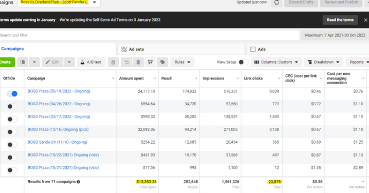 Rosati’s, a renowned restaurant chain in the USA, aimed to enhance customer acquisition, streamline engagement, and maximize revenue through a structured digital marketing strategy. With a META ads budget of $13,353.26, our objective was to increase ROI, automate customer interactions, and create a data-driven retention plan.